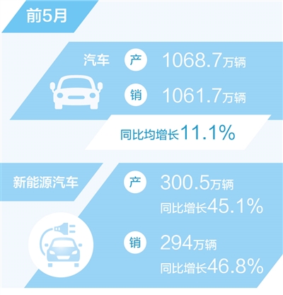 乘用車、商用車產(chǎn)銷同比均較快增長。1—5月,乘用車累計完成銷量900.1萬輛,同比增長10.7%。商用車產(chǎn)銷分別完成162.5萬輛和161.6萬輛,同比分別增長14.2%和13.7%。其中,中國品牌乘用車市場份額持續(xù)增長,前5月累計銷售478.1萬輛,同比增長22.7%,市場份額53.1%,上升5.2個百分點。