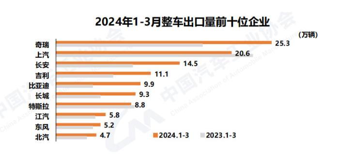 2024年一季度汽車出口數(shù)據(jù)。數(shù)據(jù)來(lái)源:中國(guó)汽車工業(yè)協(xié)會(huì)