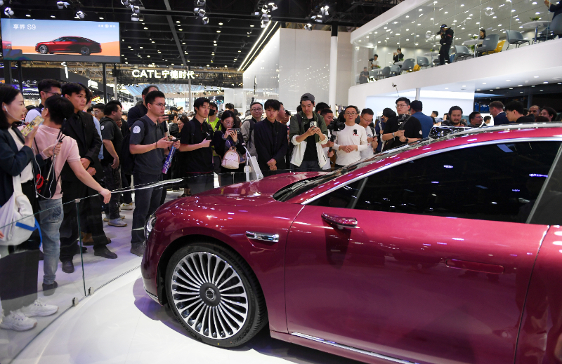 (資料圖片)4月25日,在北京中國(guó)國(guó)際展覽中心順義館舉行的2024北京車展上,參觀者觀看車展上發(fā)布的新款車型。新華社記者 鞠煥宗 攝