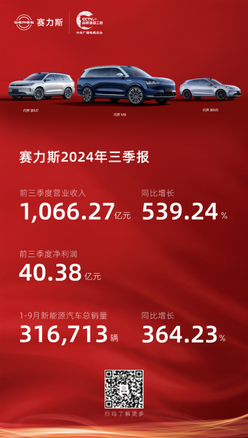 10月30日,賽力斯(601127.SH)發(fā)布2024年三季報,前三季營收1066.27億元,同比大增539.24%;歸屬于上市公司股東的凈利潤40.38億元。