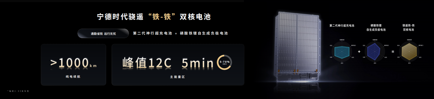 鐵-鐵雙核電池:第二代神行超充電池+磷酸鐵鋰自生成負(fù)極電池,在軸距接近3米的車型上可輕松實現(xiàn)千公里純電續(xù)航,同時讓每公里通勤成本低至1毛錢。