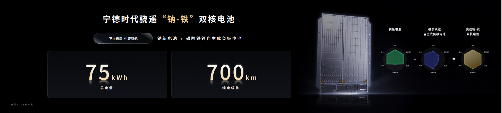 鈉-鐵雙核電池——:鈉新電池+磷酸鐵鋰自生成負(fù)極電池,充分利用鈉新電池的低溫性能,為用戶帶來不止低溫更要遠(yuǎn)航的極致體驗 。