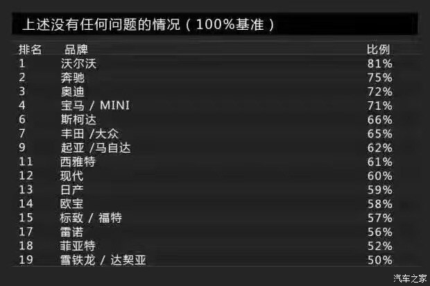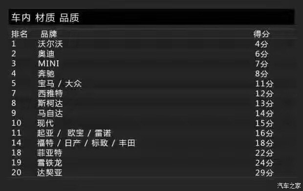 Bild調(diào)查的車身品質(zhì)(接縫)主要包括車身品質(zhì)、開關(guān)門的手感、鋼板接縫及經(jīng)常與身體接觸的地方。沒錯,這一單項(xiàng)表現(xiàn)最佳的是沃爾沃,得分為2分。這里小編要敲黑板提醒大家注意了:在車身品質(zhì)(接縫)滿意度上,得分最低表現(xiàn)最好。當(dāng)然,斯柯達(dá)也得到了2分,寶馬、奔馳則同為3分。而得分最高的就是前面提到的達(dá)契亞,它的得分是12分,換句話說就是達(dá)契亞是車身品質(zhì)滿意度最低的品牌。有意思的是與達(dá)契亞一起墊底是法系品牌雷諾,它的得分是11分。
