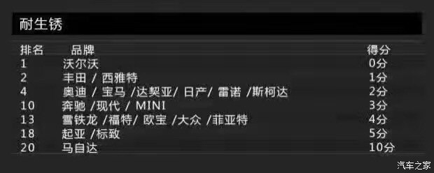 接下來這個(gè)項(xiàng)目的得分情況讓小編的心碎了一地,那就是耐生銹品質(zhì)。沃爾沃一如既往的穩(wěn)定,憑借0分的表現(xiàn)力挫群雄,險(xiǎn)勝豐田及西雅特這兩個(gè)品牌。值得關(guān)注的是,這次的倒數(shù)第一名竟換成了馬自達(dá),日系得了10分實(shí)屬少見。本來小編就打算入手一臺阿特茲,看到這個(gè)表現(xiàn),立馬變得很猶豫了有木有!生銹,生銹,居然生銹?