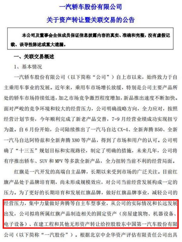 根據(jù)此前公告,一汽轎車(chē)根據(jù)資產(chǎn)評(píng)估的結(jié)果,在和一汽集團(tuán)協(xié)商一致的前提下,將評(píng)估價(jià)值為3.7億元的紅旗旗下資產(chǎn),以含增值稅人民幣 4.2億元的交易價(jià)格轉(zhuǎn)讓給一汽股份,并且表示, 本次資產(chǎn)轉(zhuǎn)讓的關(guān)聯(lián)交易已經(jīng)在第七屆董事會(huì)第七次會(huì)議中審議通過(guò),在交易合同簽署生效后20天內(nèi)一汽股份需要向一汽轎車(chē)支付轉(zhuǎn)讓資產(chǎn)價(jià)款。這意味著,紅旗品牌已歸屬于一汽股份所有,從一汽轎車(chē)中獨(dú)立出來(lái)。(圖/文 網(wǎng)通社 陳旭明)