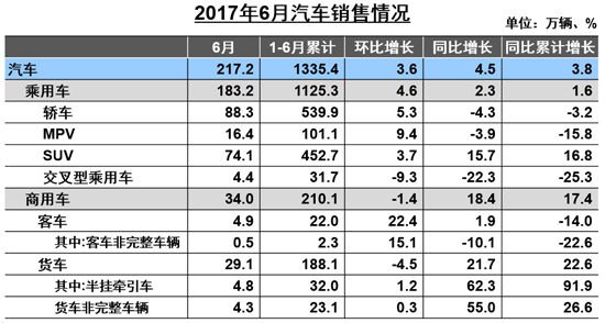 6月,我國汽車產(chǎn)銷分別為216.7萬輛和217.2萬輛,環(huán)比分別增長3.9%和3.6%,同比分別增長5.4%和4.5%。上半年,我國汽車產(chǎn)銷分別為1352.6萬輛和1335.4萬輛,比上年同期分別增長4.6%和3.8%,低于上年同期1.9和4.3個(gè)百分點(diǎn)。