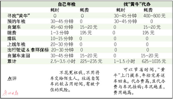 “老車(chē)”上線年檢,自己辦與找“黃?!贝k,各自需要占用多少時(shí)間和多少支出?給“黃?!钡脑┩麇X(qián),可不可以省下?