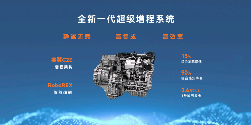 在2024年廣州車展上,全新一代賽力斯超級增程系統(tǒng)正式發(fā)布,該系統(tǒng)基于“賽翼(C2E)增程架構(gòu)”與“RoboREX智能控制技術”打造,實現(xiàn)了靜謐無感、高集成、高效率三大行業(yè)領先優(yōu)勢。