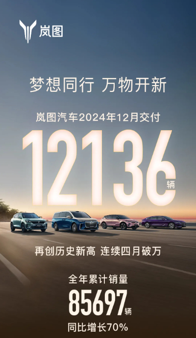 2024年1-12月,嵐圖汽車?yán)塾?jì)交付85697輛,同比增長(zhǎng)70%,迸發(fā)出強(qiáng)勁的增長(zhǎng)勢(shì)能。不僅如此,銷量實(shí)現(xiàn)“八連漲”,連續(xù)四個(gè)月躋身“萬(wàn)輛俱樂(lè)部”,且產(chǎn)品市場(chǎng)均價(jià)穩(wěn)定在35萬(wàn)元以上,使得嵐圖成為汽車企業(yè)高質(zhì)量發(fā)展的典型代表。作為用戶型科技企業(yè),嵐圖汽車將高質(zhì)量發(fā)展落實(shí)到每一處細(xì)節(jié),深度契合新產(chǎn)業(yè)、新業(yè)態(tài)、新模式要求,走出了一條獨(dú)具特色且極具示范意義的道路。