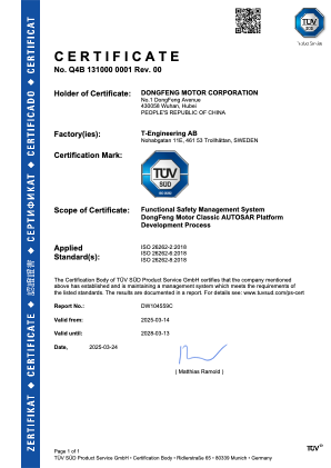 東風(fēng)汽車自主AUTOSAR平臺(tái)獲得ISO 26262 ASIL-D級(jí)流程認(rèn)證證書,充分證明了該平臺(tái)在功能安全流程管理、風(fēng)險(xiǎn)分析、開發(fā)驗(yàn)證等方面均滿足最高安全等級(jí)要求,能夠有效支撐智能駕駛、新能源汽車等場景下對(duì)高安全性的需求,進(jìn)一步彰顯了東風(fēng)汽車在功能安全領(lǐng)域的技術(shù)底蘊(yùn)。