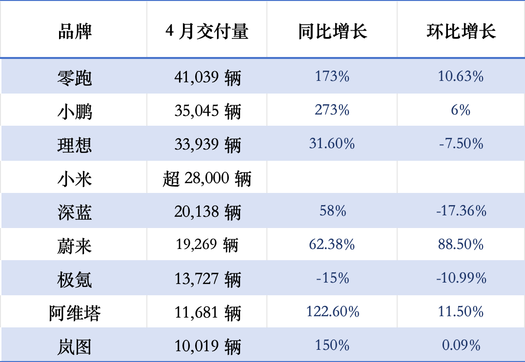 盡管行業(yè)淘汰賽加速,但多數(shù)新勢(shì)力品牌仍保持強(qiáng)勁增長(zhǎng)勢(shì)頭。4月零跑、小鵬、嵐圖、阿維塔等都實(shí)現(xiàn)了翻倍增長(zhǎng),單品牌月交付量超2萬輛的品牌達(dá)到了5個(gè),去年同期只有兩個(gè)品牌月交付量超2萬輛。