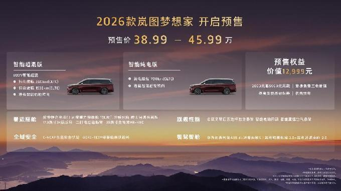 8月29日,第二十八屆成都國際汽車展覽會盛大開幕。全面煥新升級的“新時代旗艦MPV”2026款嵐圖夢想家預售亮相。本次新車共推出智能超混版和智能純電版兩個動力版本,預售價為38.99萬-45.99萬,同步推出了價值超萬元的多項重磅權(quán)益,包括2000元抵5000元尾款的膨脹金,終身免費三電質(zhì)保、終身免費基礎(chǔ)保養(yǎng)和優(yōu)先交付提車。9月1日起,2026款嵐圖夢想家展車、試駕車將陸續(xù)到店,消費者可以進店親自體驗新車的獨特魅力。