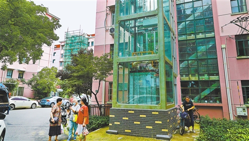 在上海市長(zhǎng)寧區(qū)北新涇街道新涇六村,居民在加裝了電梯的12號(hào)樓旁聊天(新華社記者 方喆/攝)