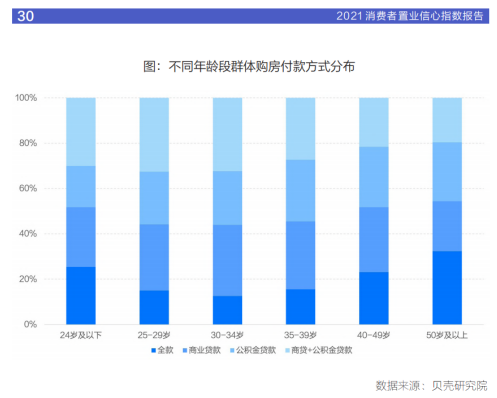 《報(bào)告》還顯示,消費(fèi)客群普遍通過加杠桿方式購房,受調(diào)群體中全款購房比例僅占 18.1%。對比不同年齡段群體看,25-39歲群體對杠桿的依賴度較高,貸款購房比例超過8成,其中30-34年齡段群體貸款比例最高,達(dá)87.4%。80前群體資金積累相較充足,對杠桿的依賴度相對較低,貸款比例未超過8成。95后父母多為60、70后,而這兩代人已經(jīng)有一定的財(cái)富積累,在購置房產(chǎn)時,有能力對子女進(jìn)行資助,因此購房群體中全款購房比例相對較高。從購房群體的需求類型看,首次置業(yè)群體購房杠桿較高,貸款比例達(dá)86.6%。