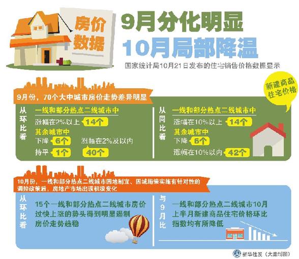 新華社北京10月21日電(記者王希)國家統(tǒng)計局21日發(fā)布的住宅銷售價格數(shù)據(jù)顯示,9月份70個大中城市房價分化明顯,10月份一線和部分熱點二線城市有針對性地實施調控政策,房地產(chǎn)市場明顯降溫。