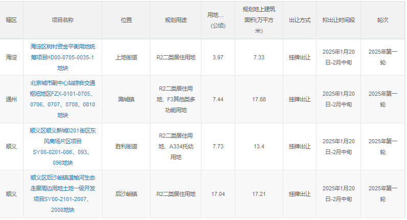 同一天,北京市規(guī)劃和自然資源委員會網(wǎng)站發(fā)布了2025年度第一輪擬供應(yīng)商品住宅用地清單,共涉及4宗地,土地面積約36.18公頃,建筑規(guī)模約55.82萬平方米,將于2025年2月中旬供應(yīng)。整體來看,本輪推出地塊均位于市場需求突出、基礎(chǔ)設(shè)施和公共服務(wù)配套較好的區(qū)域,共涉及海淀、城市副中心、順義新城和后沙峪4宗地。