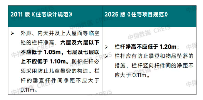2011版《住宅設計規(guī)范》按住宅層數(shù)對陽臺欄桿高度提出了不同要求,2022版《住宅項目規(guī)范》(征求意見稿)將陽臺欄桿高度統(tǒng)一調(diào)整為1.1米,2025版新規(guī)再次將這一標準提高至1.2米。