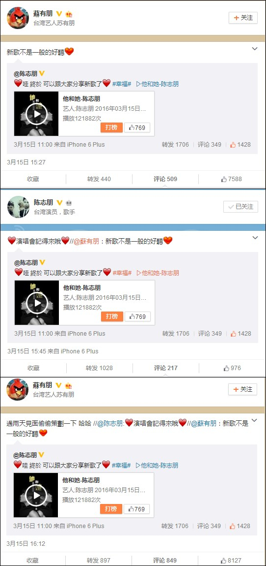 3月15日下午,臺灣歌手陳志朋在微博宣傳自己的新歌《他和她》,之前曾和陳志朋傳過不合的小虎隊另外一個成員蘇有朋第一時間轉(zhuǎn)發(fā)了該微博,并大贊“新歌不是一般的好聽”,幾分鐘后,陳志朋回復(fù)“演唱會記得來哦”,正當(dāng)大家以為互動就這么結(jié)束的時候,蘇有朋“過兩天見面偷偷策劃一下 哈哈”。