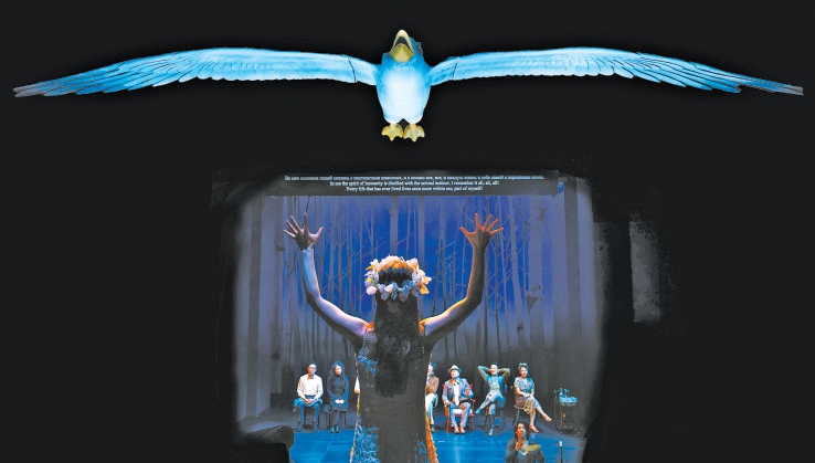 為了實現(xiàn)這一理念,劇組對舞臺進行了大刀闊斧的改造,拆除了部分觀眾席座位,使得舞臺與觀眾席之間形成了一條真實的“路”。一只巨大的海鷗懸掛在觀眾席上方,成為連接現(xiàn)實與戲劇世界的紐帶。這種獨特的舞臺設計,讓每一位走進劇場的觀眾可以看到一個與傳統(tǒng)鏡框舞臺截然不同的開放式空間,它打破了舞臺與觀眾席之間的界限,不僅營造出一種開放而沉浸的觀演環(huán)境,讓演員的表演更加自然流暢,也讓觀眾能夠更加近距離地感受到劇中人物的情感波動和命運變遷。