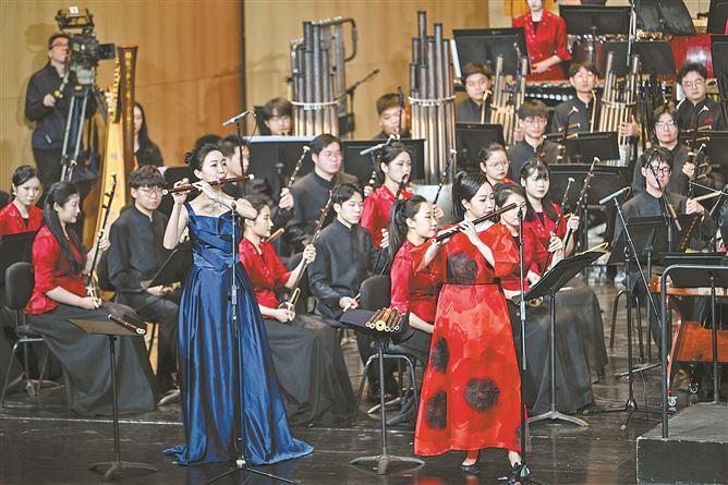 展現(xiàn)“潮”與“年輕態(tài)”的當(dāng)代民樂作品——雙竹笛協(xié)奏曲《熱情與冷漠的邂逅》融入了南音元素。(廈門日?qǐng)?bào)記者 林銘鴻 攝)