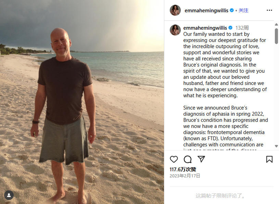 艾瑪·海明·威利斯。來源:視頻截圖 大銀幕上,布魯斯·威利斯曾給影迷留下無數(shù)經(jīng)典回憶。風(fēng)靡全球的《虎膽龍威》系列電影中,他成功塑造的“打不死的孤膽警探”約翰·麥卡倫深入人心。在40多年的演藝生涯中,威利斯曾出演《藍(lán)色月光》《低俗小說》《第五元素》《十二猴子》《第六感》《世界末日》《赤焰戰(zhàn)場(chǎng)》等不同類型的影視作品,被稱為“熒幕上不敗的硬漢”。 2022年,布魯斯·威利斯的家人發(fā)布聯(lián)合聲明,宣布他將退出演藝事業(yè)。因?yàn)樗辉\斷患上失語(yǔ)癥,這影響了他的認(rèn)知能力和溝通能力。一年后,家人再次發(fā)文透露,他的病情進(jìn)一步發(fā)展,且有了更具體的診斷結(jié)果:額顳葉癡呆(FTD)。