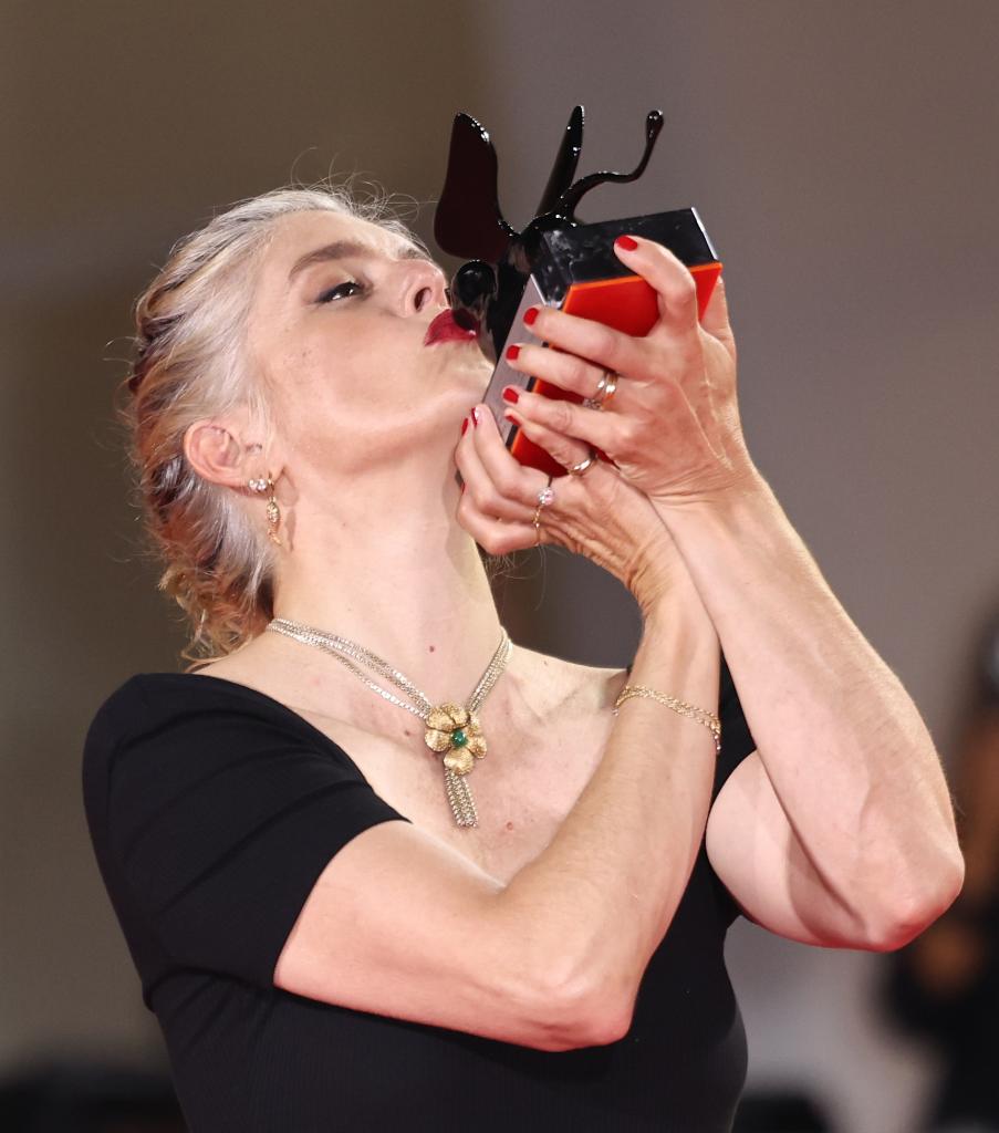 9月6日,在意大利威尼斯,最佳新演員獎獲得者、電影《寂靜的朋友》演員盧娜·韋德勒與獎杯合影。新華社記者 李京 攝