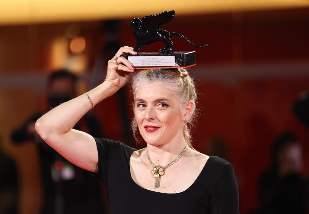 9月6日,在意大利威尼斯,最佳劇本獎獲得者、電影《執(zhí)筆》導(dǎo)演瓦萊麗·唐澤利與獎杯合影。新華社記者 李京 攝