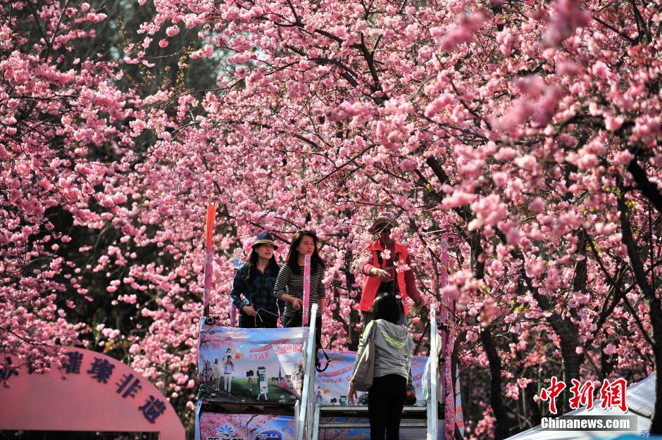 近日,昆明圓通山的櫻花和海棠花逐漸進入盛花期,引來眾多市民踏春趕花潮。圓通山工作人員介紹,受此前寒潮的影響,海棠和櫻花花期推遲,但顏色比往年更艷麗且花量增加。中新社記者 劉冉陽 攝