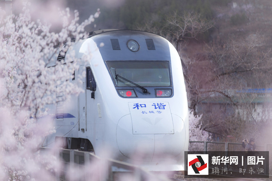 2016年3月23日,中國(guó)北京,又到一年花開時(shí),數(shù)京城最美的鐵路景色還看京張鐵路居庸關(guān)。漫山遍野的桃花盛開,S2雪白的列車穿行其中,美不勝收。圖片來(lái)源:東方IC