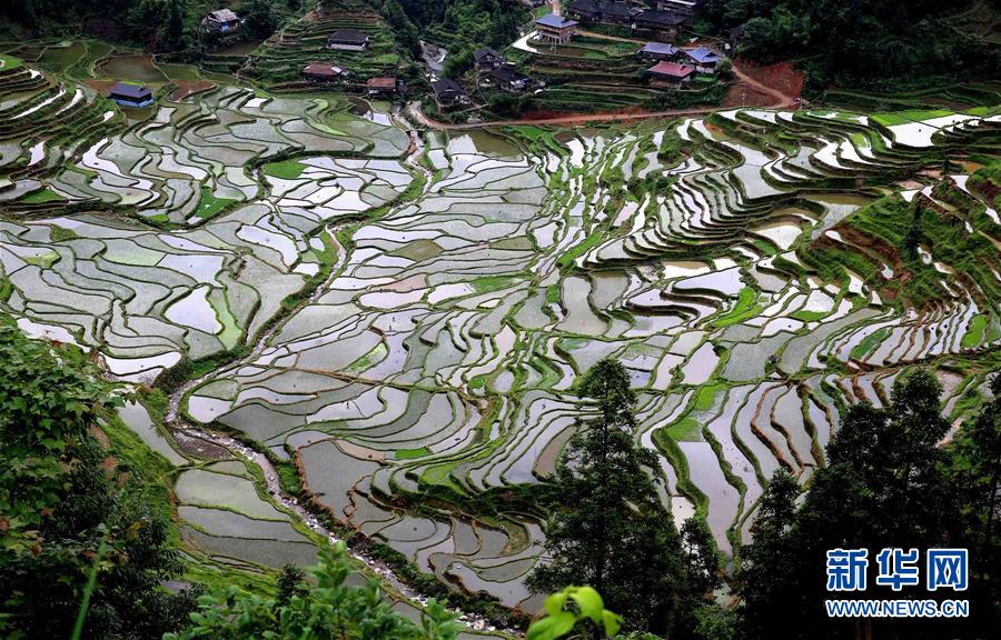 5月20日在廣西柳州市融水苗族自治縣桿洞鄉(xiāng)拍攝的梯田。廣西柳州市融水苗族自治縣桿洞鄉(xiāng)平均海拔780多米,是全縣高海拔鄉(xiāng)鎮(zhèn)之一。這里的梯田多在高山,人們稱之為“天上糧倉(cāng)”。時(shí)下,“天上糧倉(cāng)”或儲(chǔ)水待插,或新秧初栽,如織錦一般美不勝收。新華社發(fā)(龍濤 攝)