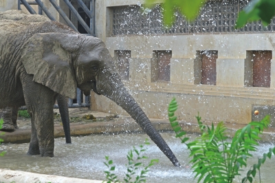 在大象展區(qū),寬敞的運(yùn)動(dòng)場(chǎng)地上,淋浴噴頭頗為顯眼,下方還有一個(gè)半米多深的水池,天氣熱的時(shí)候,大象可以邊淋浴邊戲水,時(shí)不時(shí)甩開長(zhǎng)鼻子吸起水來(lái)為自己沖涼。運(yùn)動(dòng)場(chǎng)上還有兩個(gè)七八米高的草棚,沖完涼的大象可以躺在下面乘涼休息。
