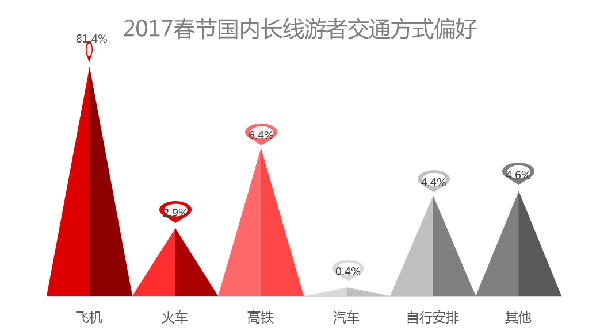 出游交通工具選擇方面,81.4%的國內(nèi)長線游者選擇了飛機(選擇了以飛機為交通方式的旅游團或自由行套餐),其次是高鐵,占比6.4%。