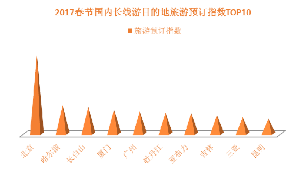 一般情況下,春節(jié)期間的國內(nèi)長線游(行程3日以上,居住地300公里外)需求的出游人數(shù)在總體長線游需求中占比最大。《報告》數(shù)據(jù)顯示,北京、哈爾濱、長白山、廈門、廣州、牡丹江、亞布力、吉林、三亞、昆明是2017年春節(jié)期間最熱門的十個目的地(以《報告》發(fā)布時的線路預訂數(shù)據(jù)統(tǒng)計),其中哈爾濱、長白山、牡丹江、亞布力、吉林五個目的地全部來自東北地區(qū),春節(jié)期間冰雪游線路的火爆是它們上榜的共同原因,廈門、三亞、昆明等則為黃金周國內(nèi)游傳統(tǒng)熱門目的地。另外,不同城市居民春節(jié)國內(nèi)長線游的目的地偏好略有差異,例如,北京最受歡迎的春節(jié)國內(nèi)游目的地主要有廣州、珠海、哈爾濱、長白山,上海最受歡迎的春節(jié)國內(nèi)游目的地主要有長白山、北海、三亞、北京等,廣州最受歡迎的春節(jié)國內(nèi)游目的地主要有貴陽、張家界等。