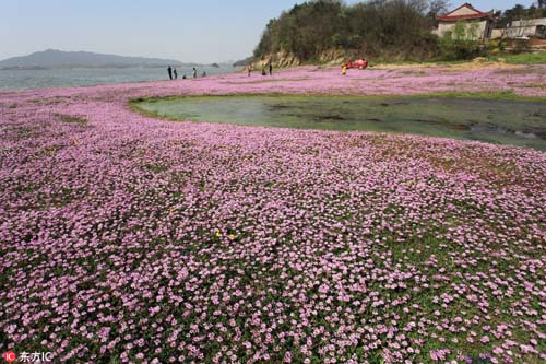 2017年3月26日,在我國最大淡水湖鄱陽湖畔,紫云英等盡情綻放。藍(lán)天白云,青山碧水,紅花綠草構(gòu)成的醉美春色,吸引不少游客觀賞拍攝。