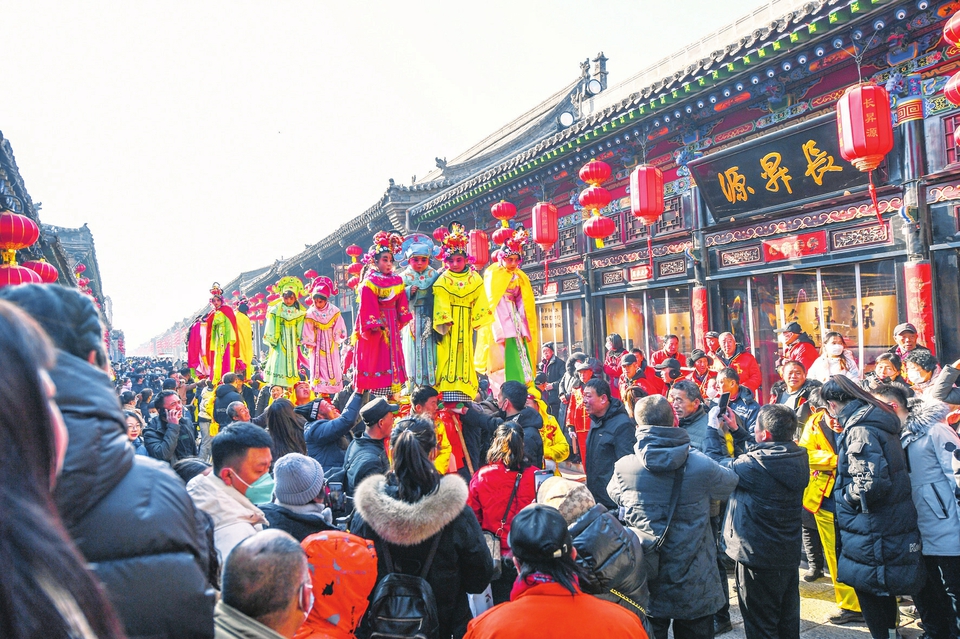 1月31日,游客在平遙古城觀看民俗社火表演。元宵節(jié)臨近,平遙古城內(nèi)舉行具有當?shù)靥厣拿袼渍寡莼顒?,熱熱鬧鬧迎元宵。