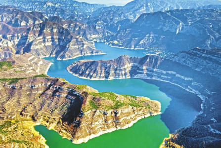 10月21日,在太原汾河二庫風(fēng)景區(qū),群山環(huán)繞于曲折迂回的水庫周圍,雄險奇秀,水清柔碧綠。如畫山水間,獨特的峽谷風(fēng)光十分壯觀。