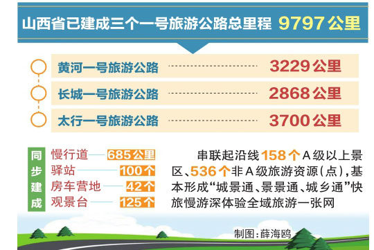 截至今年10月10日,山西省已建成三個(gè)一號旅游公路總里程9797公里。其中,黃河一號旅游公路3229公里、長城一號旅游公路2868公里、太行一號旅游公路3700公里,同步建成慢行道685公里、驛站100個(gè)、房車營地42個(gè)、觀景臺125個(gè),串聯(lián)起沿線158個(gè)A級以上景區(qū)、536個(gè)非A級旅游資源(點(diǎn)),基本形成“城景通、景景通、城鄉(xiāng)通”快旅慢游深體驗(yàn)全域旅游一張網(wǎng)。