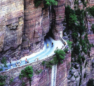 在太行山脈的晉豫交界帶,是我國(guó)第一階梯和第二階梯的分界線。在山脈的東西兩側(cè),地勢(shì)險(xiǎn)要,垂直落差極大,形成了一座座筆直陡峭的懸崖絕壁,也構(gòu)造了大自然鬼斧神工的絕佳壯美奇景,卻也因此地形阻礙了大山居民的出行之路,千百年來(lái)的大山人民過(guò)著與世隔絕的生活。到了20世紀(jì)五六十年代,大山的居民們以愚公移山的精神,克服重重苦難,在懸崖峭壁上一錘一斧開(kāi)出了一條條連接大山與外界的“掛壁公路”。