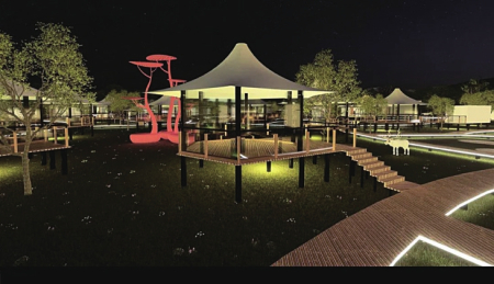 游玩至傍晚需要一處別樣的休憩之所,在鸛雀樓景區(qū)有一家很值得住一晚休息放松的民宿,那就是鸛棲苑民宿酒店。這個酒店以鸛雀樓的花海為依托,展開建筑的單體布局,又通過陣列組合形成一個大花瓣,客房之間用棧道連接,白天賞花海,夜晚觀花燈,好不自在。酒店還有一個可以露營的營地,緊鄰黃河還可以燒烤。在接待中心頂層還有一個觀光平臺,有卡座可以休憩和賞景。夜晚的彩燈亮起,繁花縈繞,讓人仿佛置身仙境。