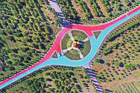 在得勝堡不遠(yuǎn)處,長城一號旅游公路蜿蜒而過。車行其上,仿佛置身于絢爛的畫卷之中,紅藍(lán)黃交織的道路色彩鮮艷;環(huán)顧四周,云海翻騰。長城驛站為游客提供休憩之所,路旁是遼闊的綠丘和連綿的樹林。