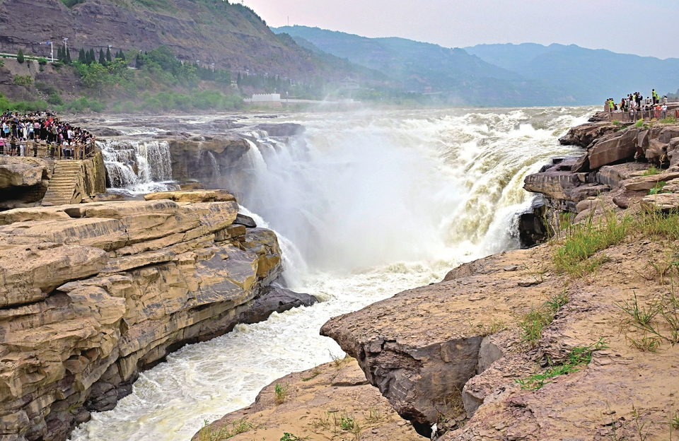 7月2日,游客在吉縣黃河壺口瀑布景區(qū)游覽觀瀑。近日,黃河進入主汛期,受上游降雨增多和水庫調(diào)節(jié)放水影響,黃河壺口瀑布水量大增,吸引了眾多游客。