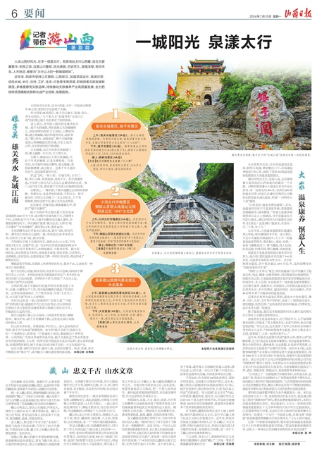 遠(yuǎn)眺大汖古村,房屋依山而建鱗次櫛比。 人說山西好風(fēng)光,左手一指是太行。陽泉地處太行山西麓,自古為晉冀要沖、形勝之地,這里山川疊翠、風(fēng)光旖旎,歷史悠久、底蘊(yùn)深厚,物華天寶、人杰地靈,被譽(yù)為“太行山上的一顆璀璨明珠”。 近年來,陽泉市堅(jiān)持以文塑旅、以旅彰文,加強(qiáng)頂層設(shè)計、高端引領(lǐng),依托長城、太行、古村、工礦、生態(tài)、紅色等豐厚資源,積極探索文旅發(fā)展新路徑,多維度擦亮文旅品牌,持續(xù)推動文旅康養(yǎng)產(chǎn)業(yè)高質(zhì)量發(fā)展,全力把獨(dú)特資源稟賦優(yōu)勢轉(zhuǎn)化成產(chǎn)業(yè)優(yōu)勢、發(fā)展勝勢。 娘子關(guān) 雄關(guān)秀水 北域江南 從陽泉市區(qū)出發(fā),沿315省道、太行一號旅游公路驅(qū)車40公里,便到達(dá)平定縣娘子關(guān)鎮(zhèn)。 作為國家4A級景區(qū),娘子關(guān)以雄關(guān)、險道、崇山、秀水而聞名,“天下第九關(guān)”的雄偉和“北國小江南”的輕柔讓娘子關(guān)的美有了別樣韻味。 進(jìn)入景區(qū),首先映入眼簾的是雄偉的關(guān)樓。娘子關(guān)的城堡,背依高接云天的嵯峨綿山,面臨澗壁如削的萬丈深峪,山腰的垣堞,隨山勢蜿蜒,桃河環(huán)繞其西北,曲折奔流,“襟山帶水,金城湯池”,整個關(guān)城兩翼是依山勢蜿蜒起伏的長城,歷史上成為山西、河北兩省間的天然屏障。 古關(guān)城樓,由巨大的青石塊砌成門洞,樓上匾額一行大字:天下第九關(guān)。 關(guān)樓下,路面由巨大青石塊鋪就,歷經(jīng)千年風(fēng)雨磨損,已是光滑锃亮。行走其間,似乎能聽到戰(zhàn)馬嘶鳴、炮火隆隆,看到戰(zhàn)旗獵獵、戰(zhàn)士挺立。這條千年古道沿用至今,述說著厚重的歷史。 穿過門洞,一條小街。石墻石階,古木門楣,青石小路,彎彎曲曲,高低不平。陽光灑滿街道,守關(guān)將士的后人們,在這兒過著恬淡的生活。推門,每個院子里,都有屬于守關(guān)將士們獨(dú)特的故事。 關(guān)樓頂上,一尊彩塑,干練中透露出女性特有的嬌媚。李淵長女,也是李世民姐姐,平陽公主。駐守雄關(guān)時,平陽公主訓(xùn)練了一支女兵隊(duì)伍,個個英姿颯爽,曾在這里守關(guān),娘子關(guān)亦由此得名。 走過雄關(guān),穿越花海,循著潺潺水聲,便到了“娘子關(guān)瀑布”。 娘子關(guān)擁有華北地區(qū)最大的巖溶泉泉域面積3600平方千米,泉水集中區(qū)域?yàn)槟镒雨P(guān)、河灘等5個村,總面積22平方千米,大量不間斷的泉水融入瀑布,沿著懸崖傾瀉而下。西北側(cè)的“懸泉”最為出名,又稱為“娘子關(guān)瀑布”“水簾洞瀑布”,瀑布寬6.5米,落差40米。 水簾洞瀑布由許多泉水匯成巨流,懸空飛灑、珠花四射。瀑布如白簾掛在山壁前一般,形成高達(dá)20多米的水簾,在陽光下五彩飛虹,蔚為壯觀。 平陽湖位于娘子關(guān)綿河河谷,湖面全長1.5公里,平均深度3米左右,呈葫蘆形,是一處利用自然地形建造的峽谷平湖。峽谷中有許多象形石,如神龜渡河、大象戲水等。最為奇特的是,南北兩崖各不相同,南崖泉水垂流,鐘乳多姿、石質(zhì)多孔,呈黃褐色,沒有層紋;北崖卻是如刀劈一樣的石灰?guī)r層,兩邊形成了鮮明的對比。 乘船游覽平陽湖,在湖面上欣賞兩岸的風(fēng)光,置身于此,讓游客有一種身在江南的感覺。 娘子關(guān)村依山而建、順?biāo)?,房舍多為石頭壘砌,每間房子都有百年以上歷史。水網(wǎng)似的溪水沿著墻基穿房過戶,村中的婦女各自在家門口洗衣洗菜。水帶給村子靈氣,形成了“人在水上走,水在屋下流”的人間美景。 元明時期,娘子關(guān)鎮(zhèn)的村民就利用水資源創(chuàng)造了水車、水磨、水碾等生產(chǎn)工具,用當(dāng)?shù)氐目饭率ㄔ炝嗣裾窬印_@里家家清波臨灶、戶戶枕水而居,盡顯“人在水上住、水從屋下流”的水上人家特色。 穿村而過的是一條以前被稱作“巖崖大道”“興隆街”的明清古道,建道的年代已經(jīng)無法考證,但從那些依舊保持古風(fēng)古韻的民居建筑和青石板路上的坑洼不平,仍能讀出久遠(yuǎn)的歷史。 驛馬關(guān)隘看日暮云沙古戰(zhàn)場,小橋流水聽悠悠石磨轉(zhuǎn)乾坤。雄關(guān)護(hù)佑,娘子關(guān)村靜靜守候,這里是北國江南獨(dú)有的煙火人家。 好山好水養(yǎng)好魚。夜幕低垂,華燈初上。游人急匆匆的步伐里,娘子關(guān)“全魚宴”粉墨登場。如今的“娘子關(guān)魚”已是娘子關(guān)的一個地理標(biāo)識,即使是一個普通的小飯館,都能做出十多種花樣。從利用電廠冷卻水養(yǎng)殖羅非魚開始,娘子關(guān)魚經(jīng)過了熱水養(yǎng)殖變冷水養(yǎng)殖的轉(zhuǎn)型,又從單一的羅非魚升級成淡水魚系列品種,更從簡單的餐食,發(fā)展到觀賞垂釣,娘子關(guān)魚已經(jīng)成為娘子關(guān)的一大文化旅游產(chǎn)業(yè)。 站在關(guān)樓,諦聽歷史回音;漫步小巷,品讀世間繁華。夜游、夜演、夜市升騰景區(qū)的“煙火氣”,成為魅力小鎮(zhèn)快速發(fā)展的新動能。 本報記者白雪峰 1 固關(guān)長城景區(qū)、娘子關(guān)景區(qū) 上午:固關(guān)長城景區(qū)(3A級)。固關(guān)長城是我國現(xiàn)存唯一可考的石砌長城,被我國著名的文物專家、長城史學(xué)家羅哲文先生稱為“小八達(dá)嶺”。 下午:娘子關(guān)景區(qū)(4A級)。推薦觀看由叢明玲團(tuán)隊(duì)導(dǎo)演的演藝作