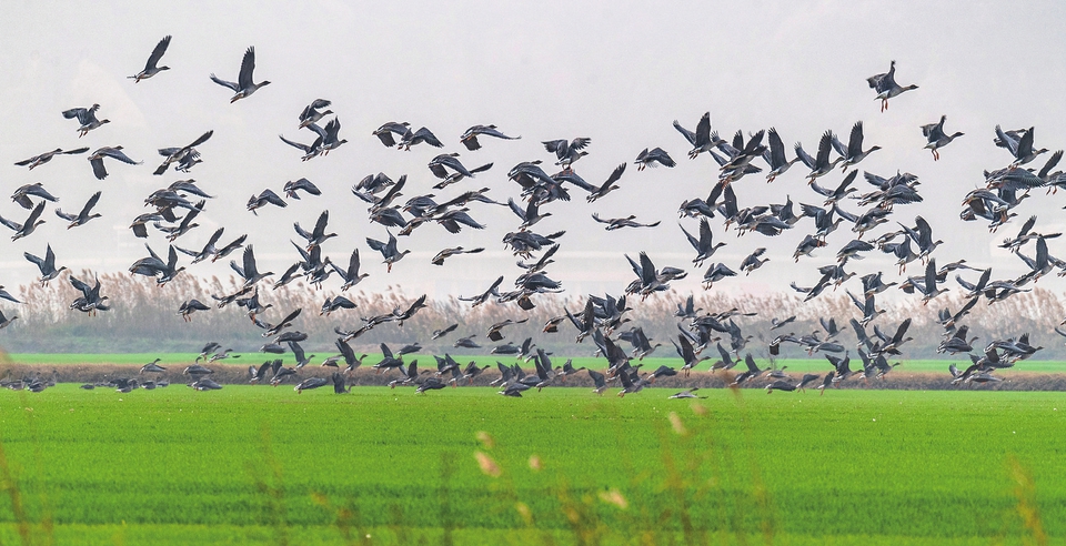 11月24日,國家二級保護動物豆雁在臨猗縣黃河濕地飛翔,給冬季的濕地注入了生機與活力。近年來,當地不斷加大黃河流域生態(tài)保護力度,對野生鳥類開展“護飛行動”,黃河濕地生態(tài)環(huán)境越來越好,來此越冬的鳥類數量和種類逐年增加。