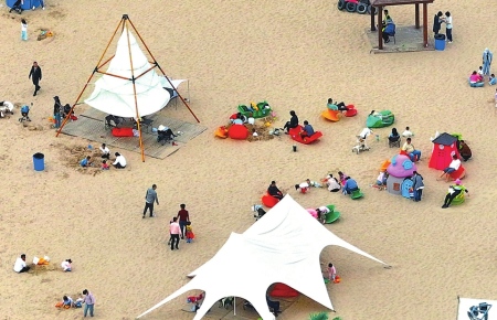 ①4月28日,太原市晉陽湖沙灘浴場,游客們正在樂享美好時光。