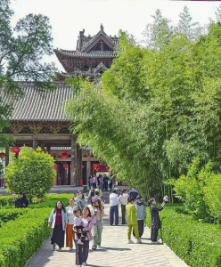 ③4月26日,游人在萬榮縣東岳廟游玩,在宜人的春光里觀賞純木質結構建筑飛云樓,感受傳統(tǒng)文化的魅力。