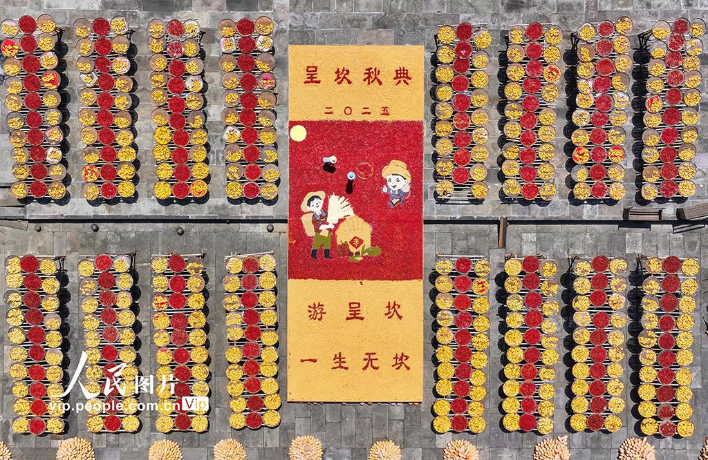 2025年8月18日,安徽省黃山市徽州區(qū)呈坎古村迎來(lái)了一年一度的“曬秋”盛景,村民們趁著晴好天氣,將豐收歸倉(cāng)的玉米、南瓜、紅辣椒等農(nóng)作物鋪滿曬場(chǎng),五彩斑斕的農(nóng)作物與徽派古建交相輝映,構(gòu)成一幅五谷豐登的秋收畫卷,吸引眾多游客前來(lái)感受豐收的喜悅。施亞磊攝(人民圖片網(wǎng))