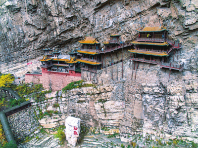 懸空寺位于恒山第二主峰翠屏峰的半崖峭壁間,始建于北魏后期,距今已有1500多年的歷史。整個建筑上載危巖,下臨深谷,樓閣懸空,結(jié)構(gòu)奇巧,是我國古建筑中罕見的杰作,堪稱“天下一絕”。詩仙李白游懸空寺后揮毫寫下“壯觀”二字,以表其懷。明代旅行家徐霞客在其著作《徐霞客游記》中稱贊懸空寺為“天下巨觀”。歷史文化名城保護委員會副主任、著名文物專家鄭孝燮視察懸空寺后題詞:“懸空寺玄、絕、奇、險,百來百看不厭”。