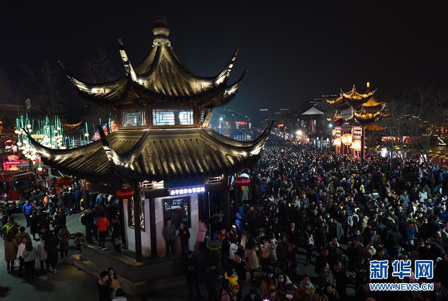 2月22日晚,游人在夫子廟景區(qū)觀燈游玩。當(dāng)晚,在江蘇南京夫子廟秦淮風(fēng)光帶舉辦的秦淮燈會(huì)彩燈齊放,人們前來(lái)觀燈鬧元宵。 新華社記者孫參攝