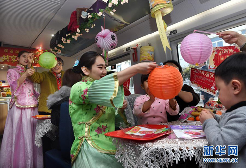 3月1日,在青島開往北京南的G184次列車上,青島高鐵餐飲公司的工作人員和旅客一起制作花燈。新華社記者 李紫恒 攝