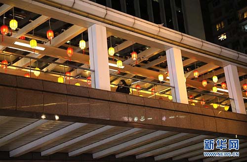 香港一過(guò)街天橋掛滿(mǎn)燈籠(1月23日攝)。 農(nóng)歷豬年臨近,香港街頭裝扮得流光溢彩,喜氣盈盈。 新華社記者 吳曉初 攝